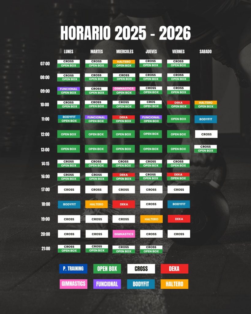 09:00 - 10:00 | 09:00 10:00 Funcional09:00 10:00 Open Box | 09:00 10:00 Crosstraining09:00 10:00 Open Box | 09:00 10:00 Gimnásticos09:00 10:00 Open Box | 09:00 10:00 Crosstraining09:00 10:00 Open Box | 09:00 10:00 Crosstraining09:00 10:00 Open Box | |